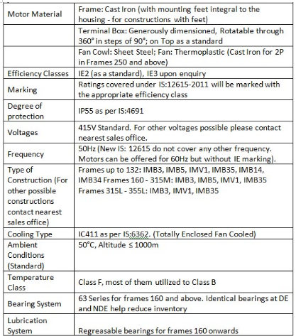 The New IS: 12615 is based on the International Standard IEC 60034-30 (2008) which defines New Efficiency Classification for single speed, three phase, induction motors. The new IS: 12615 covers single speed, three-phase, 50Hz, cage induction motors that: have rated voltage ≤1000V; have a rated output 0.37kW ≤ PN ≤ 375kW; have either 2, 4 or 6 poles; meet frame size to output relation as stipulated in IS: 1231 (for outputs covered by IS:1231); are rated on the basis of either duty type S1 (continuous duty) or S3 (intermittent periodic duty) with rated cyclic duration factor of 80% or higher; are capable of operating direct on-line; are designed for operation on virtually sinusoidal and balanced voltage conditions as defined in 7.2.1 of IS/IEC 60034-1; designed for an ambient temperature not exceeding 40°C and altitude not exceeding 1000m; have degree of protection IP55 or superior; have method of cooling IC411 in accordance with IS 6362 / IEC 60034-6; have service factor not exceeding 1.0. The Efficiency classes defined are: IE1 – Standard Efficiency IE2 – High Efficiency IE3 – Premium Efficiency The New IS:12615 also stipulates that for motors to be classified as “Energy Efficient”, these must meet at least IE2 efficiency values.
