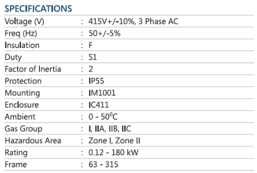 Kirloskar Electric manufactures a wide variety of AC motors. These motors are specially designed for environment prone to risk of fire or explosion viz., coal mining, oil refineries, pharmaceutical, chemical & petroleum industries. Our AC motors are designed to withstand the force of explosion, without damaging the enclosure and avoiding any contact of the internal flame (or explosion) with the external flammable gas vapour.